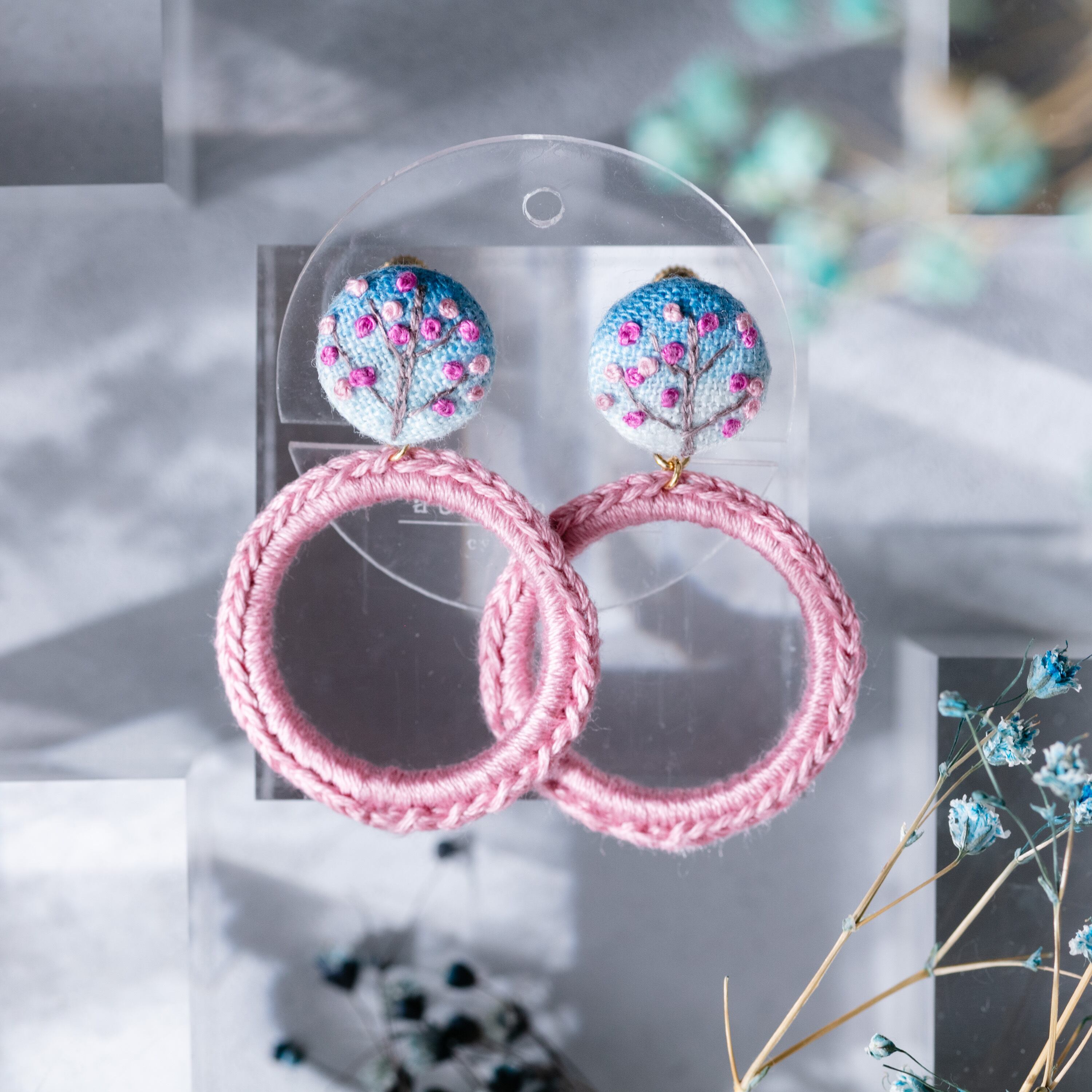 日光写真という、太陽の光でモノの形を影絵のように写し込む技法を使い、一枚一枚オリジナルデザインで手染めしています。差し色を入れて青の美しさをより一層引き出し、立体感や奥行きをつけるため手刺繍を施しています。仕立てには、できるだけ質感の良いパーツや天然素材を使用しています。