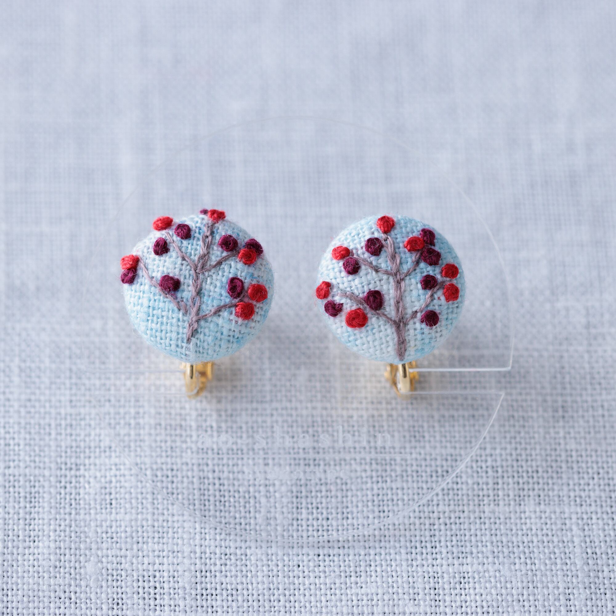 日光写真という、太陽の光でモノの形を影絵のように写し込む技法を使い、一枚一枚オリジナルデザインで手染めしています。差し色を入れて青の美しさをより一層引き出し、立体感や奥行きをつけるため手刺繍を施しています。仕立てには、できるだけ質感の良いパーツや天然素材を使用しています。