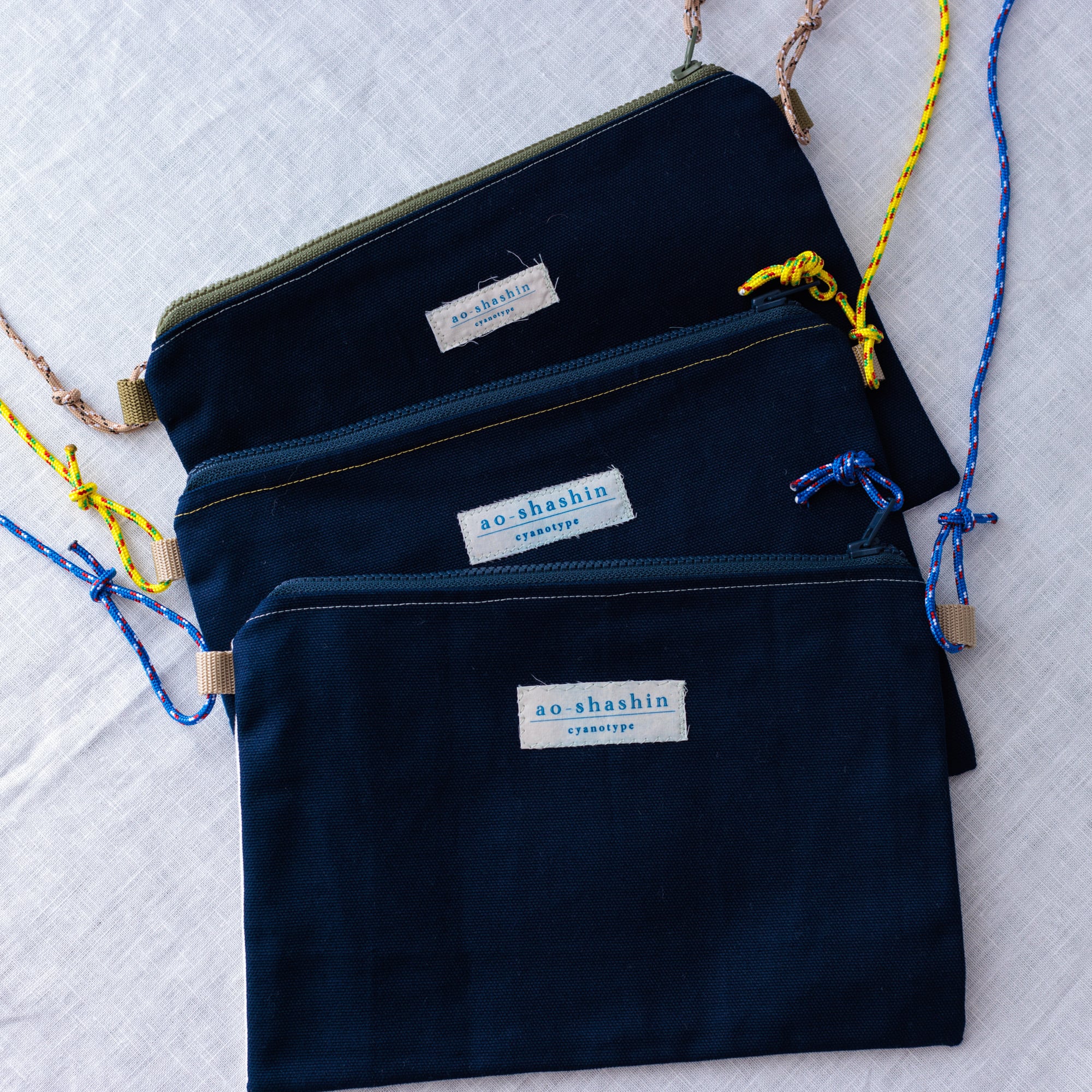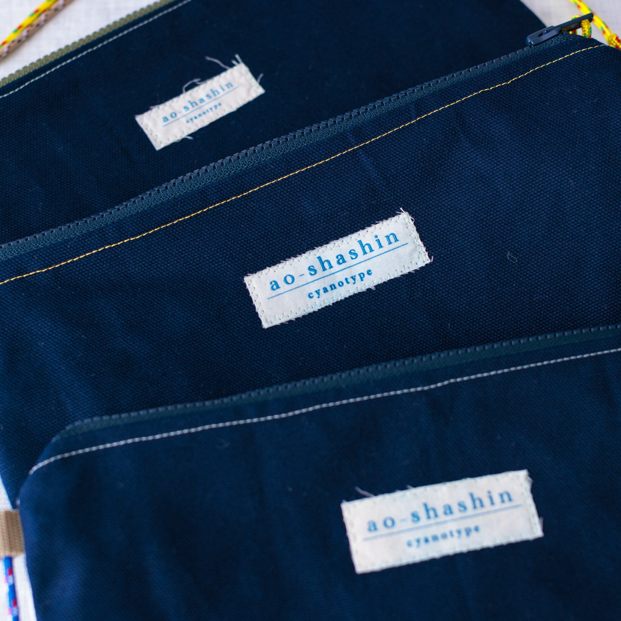 太陽の光でモノの形を影絵のように写し込む技法を使い、一枚一枚オリジナルデザインで手染めしています。差し色を入れて青の美しさをより一層引き出し、立体感や奥行きをつけるため手刺繍を施しています。仕立てには、できるだけ質感の良いパーツや天然素材を使用しています。