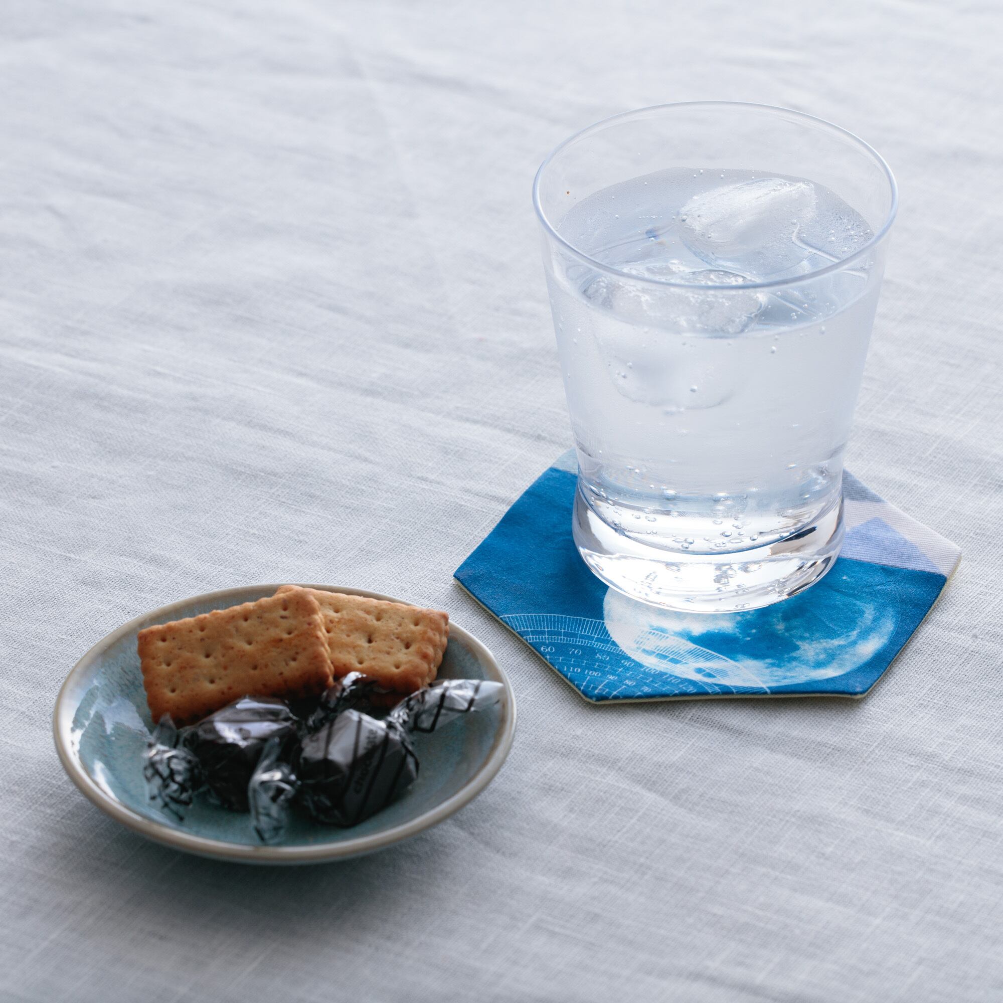 太陽の光でモノの形を影絵のように写し込む技法を使い、一枚一枚オリジナルデザインで手染めしています。差し色を入れて青の美しさをより一層引き出し、立体感や奥行きをつけるため手刺繍を施しています。仕立てには、できるだけ質感の良いパーツや天然素材を使用しています。